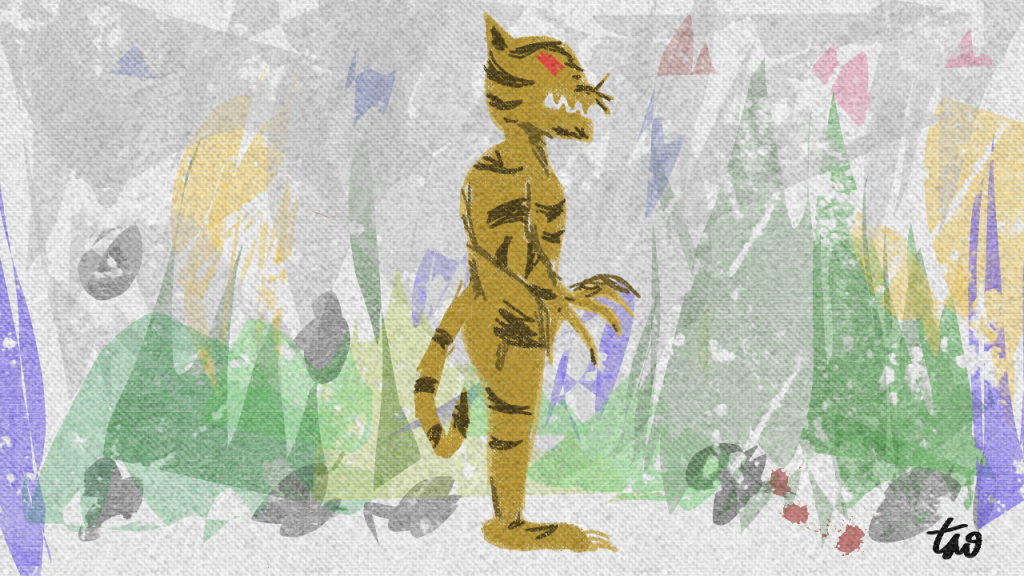 Dengan mata tertutup kain hitam, di depan kanvas, dan memegang kuas di dua tangannya, ustaz Nafi menjawab, “Berdasarkan penglihatan saya, Ki Gede Panji ini sosok yang tinggi besar, semacam setengah manusia dan harimau. Wujud jelasnya nanti akan kita lihat jika lukisan saya sudah selesai.”