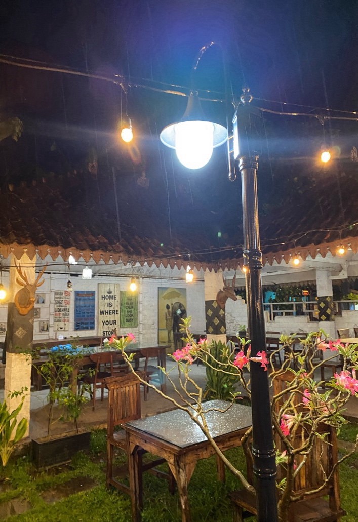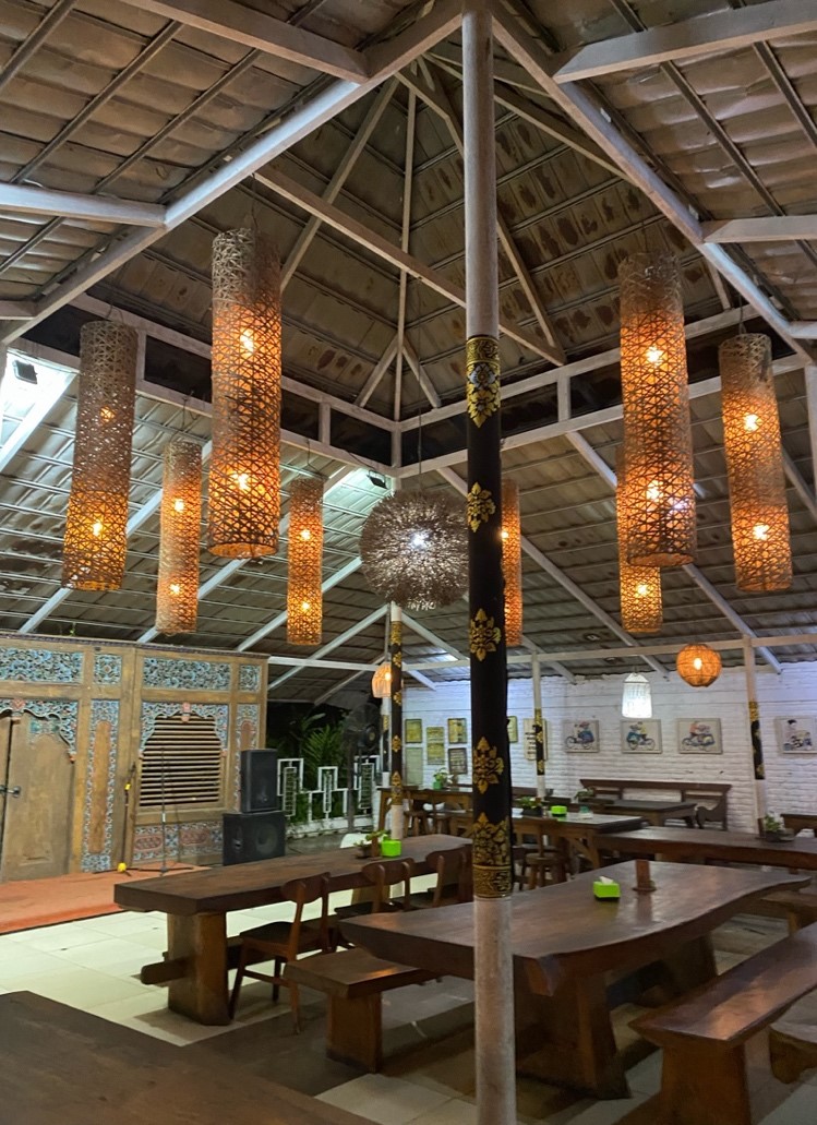 Suasana yang “adem” dan terbuka, konsep tempatnya didominasi outdoor dan semi outdoor dengan banyak pepohonan hijau dan udara terasa sejuk, cocok banget buat melepas penat dari cuaca Indramayu yang kadang cukup terik. Bangunannya mengusung konsep perpaduan Bali dan Jawa dengan sentuhan rumah Joglo. Kamu bisa pilih mau duduk santai di kursi kayu atau di lesehan.