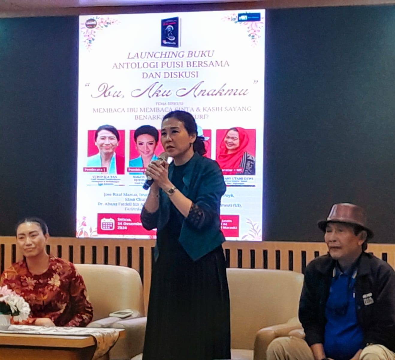 Wakil Menteri Pemberdayaan Perempuan dan Perlindungan Anak Veronica Tan membaca puisi berjudul “Ucap Ibu” karya Fanny J. Poyk pada peluncuran buku antologi puisi bersama “Ibu, Aku Anakmu” bertempat di Aula Pusat Dokumentasi Sastra (PDS) HB. Jassin, Lantai 4, Gedung Panjang Ali Sadikin di Pusat Kesenian Jakarta (PKJ) Taman Ismail Marzuki (TIM) Jakarta, Selasa sore (24/12/2024).
